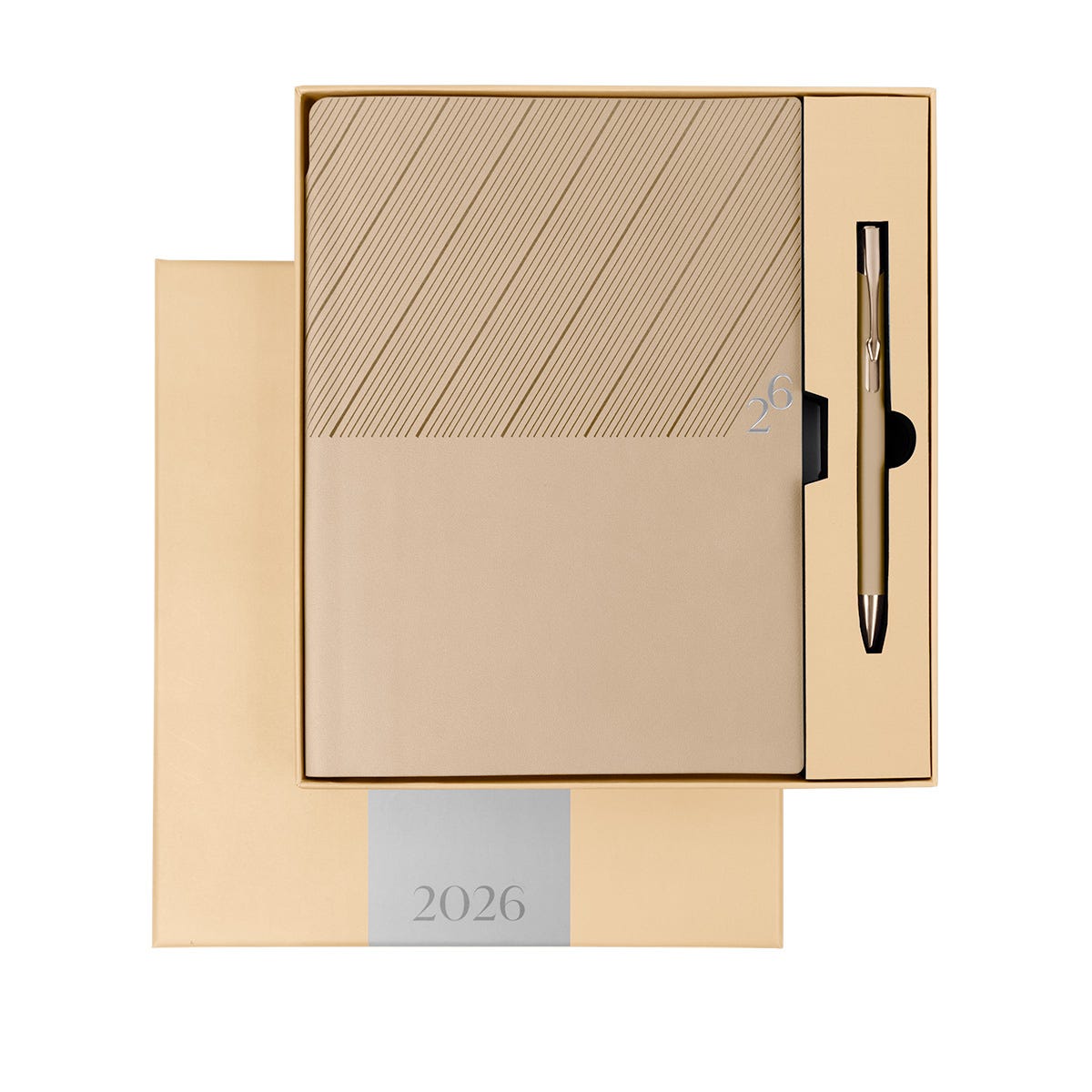 Agenda semanal con 100 hojas. Contiene datos personales, calendarios 2025-2026-2027, planeador 2026, presupuesto de gastos, seguimiento de nuevos hábitos, organizador de tareas, planeador de proyectos y días festivos. Incluye caja individual del mismo color a la agenda, separador con placa metálica y bolígrafo. Personalizada con láser.