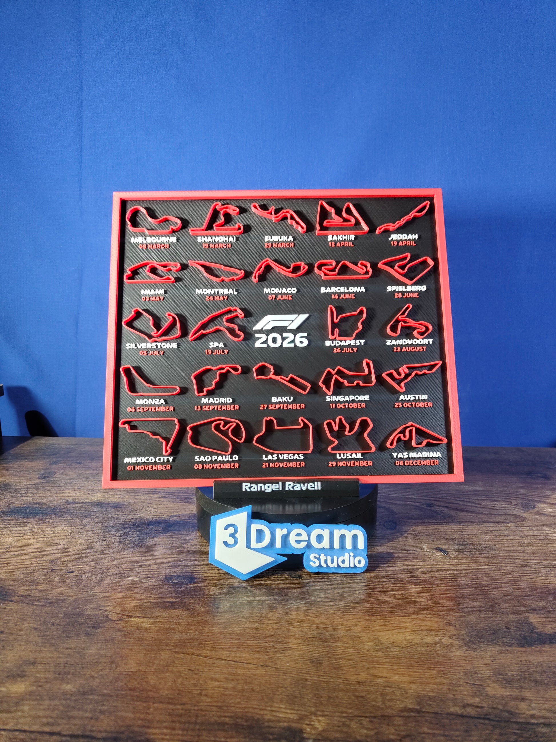Calendario 2026 Fórmula 1 impreso en 3D con base.