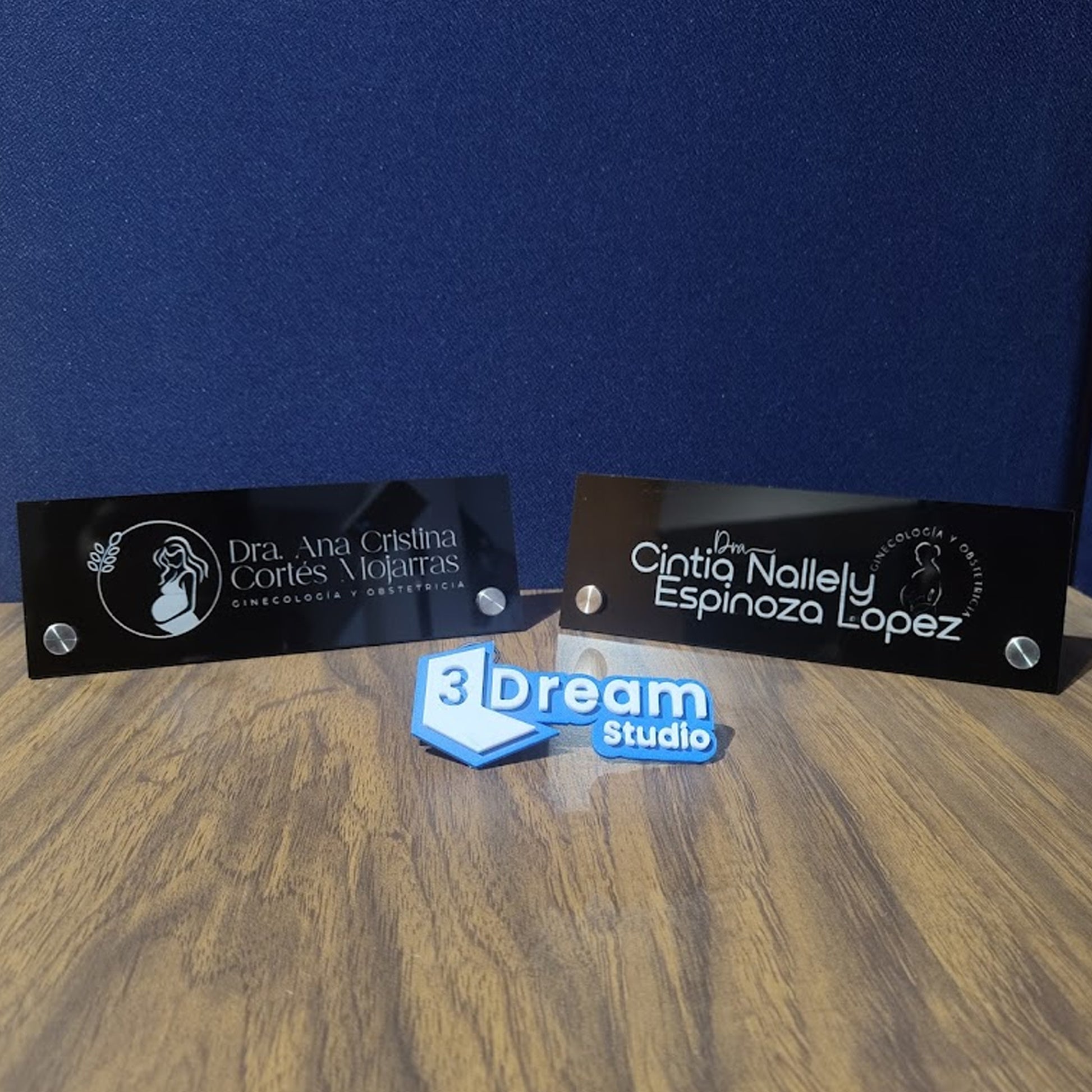 Placa grabada con láser en acrílico negro con chapetones 20x7 cm
