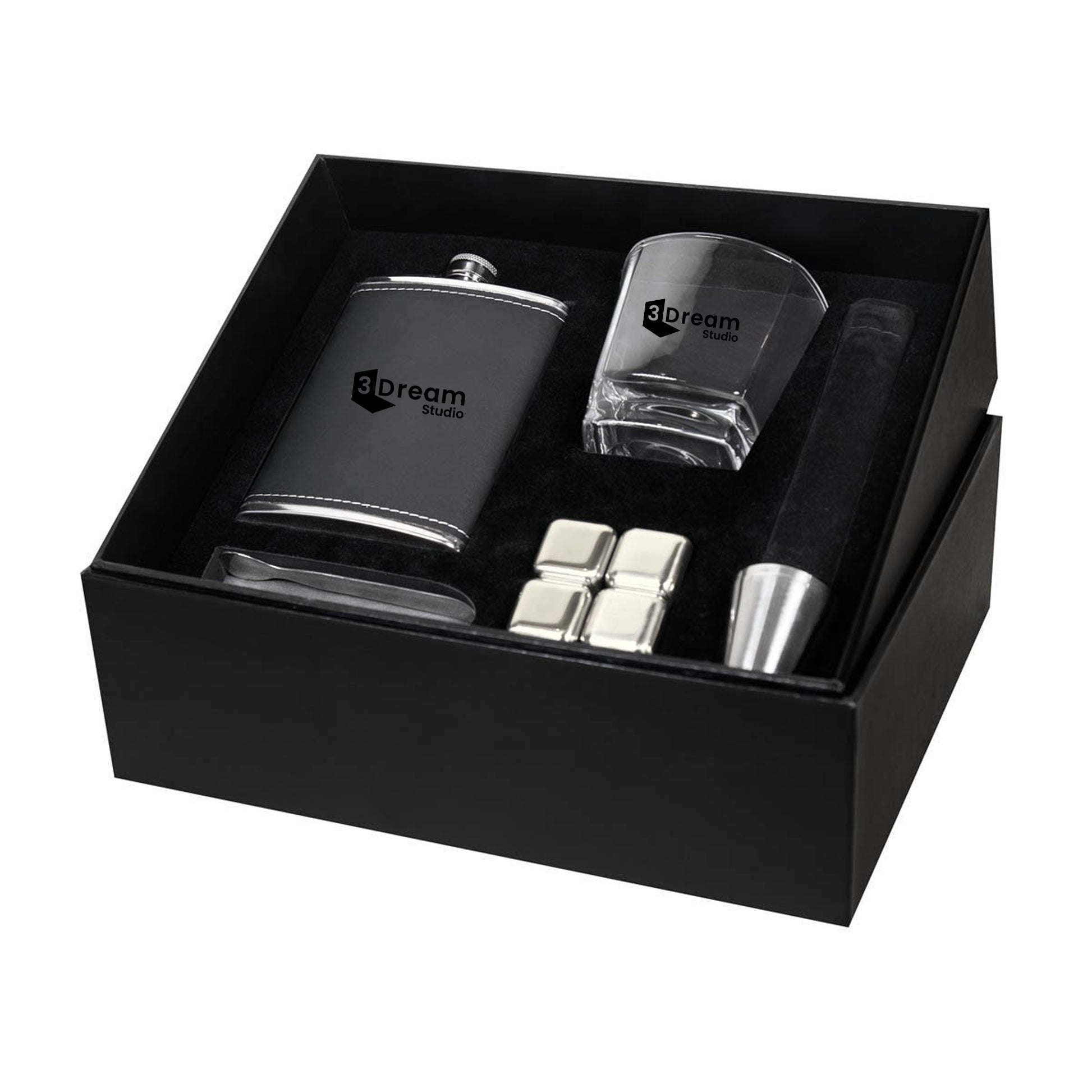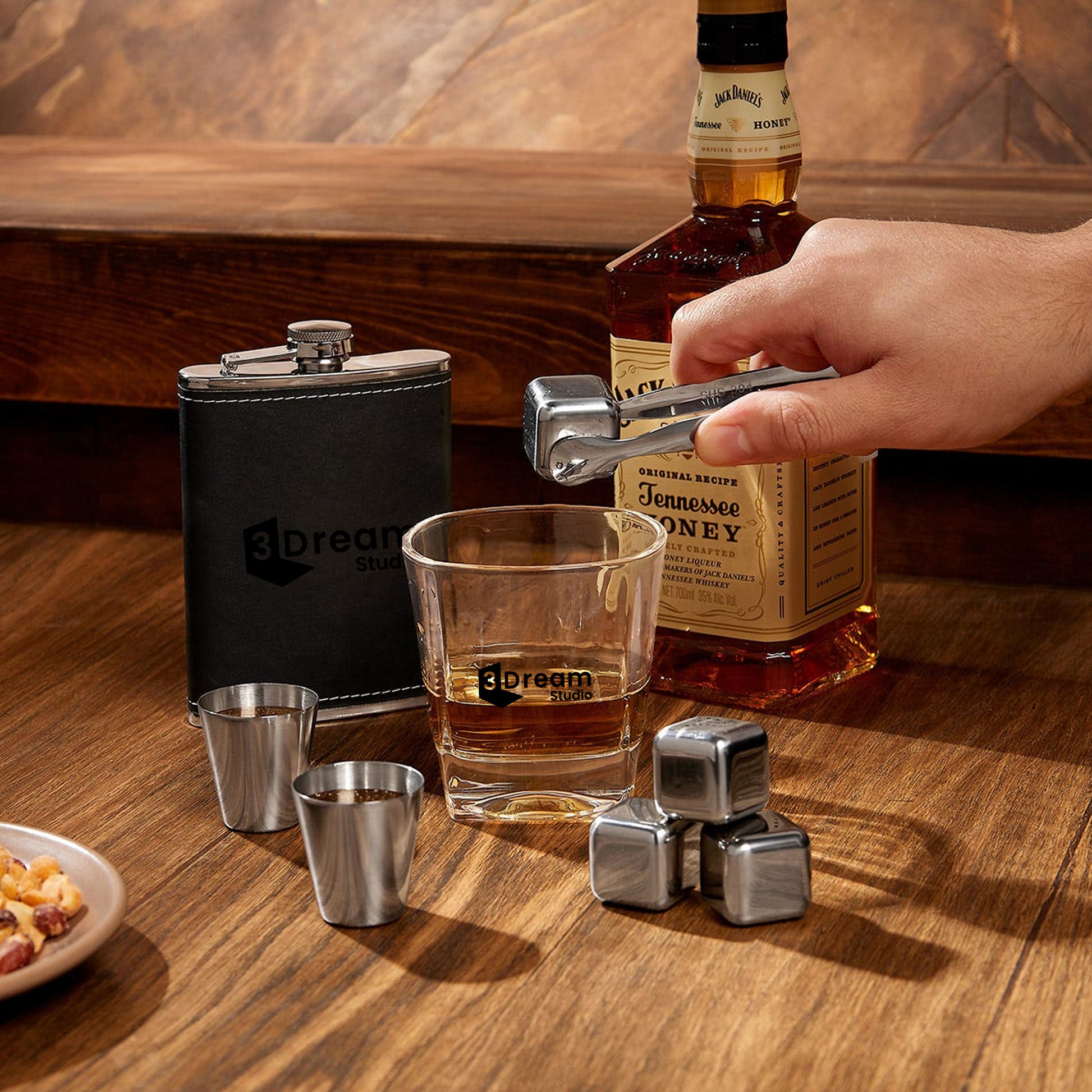 Set de bar. Incluye caja rígida de regalo, licorera con funda de curpiel y tapa con rosca para evitar derrames, vaso de cristal, set de 4 cubos enfriadores con funda de terciopelo, pinzas para hielo y 2 mini vasos metálicos. Personalizado con láser y DTF UV.