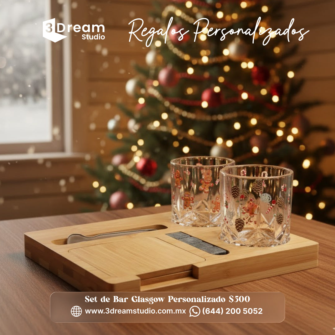Set de bar con base de bambú. Incluye 2 vasos de cristal para whisky, 4 cubos enfriadores de granito, 2 portavasos de bambú y pinzas para hielo de acero inoxidable. Personalizado con láser y DTF UV.