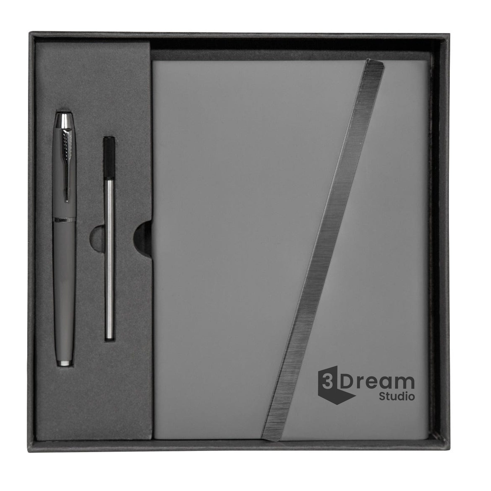 Set de regalo que incluye una libreta de 80 hojas a rayas, con pasta rígida y solapa magnética, un bolígrafo metálico y un repuesto de tinta adicional. Caja de regalo incluida. Personalizado con láser.